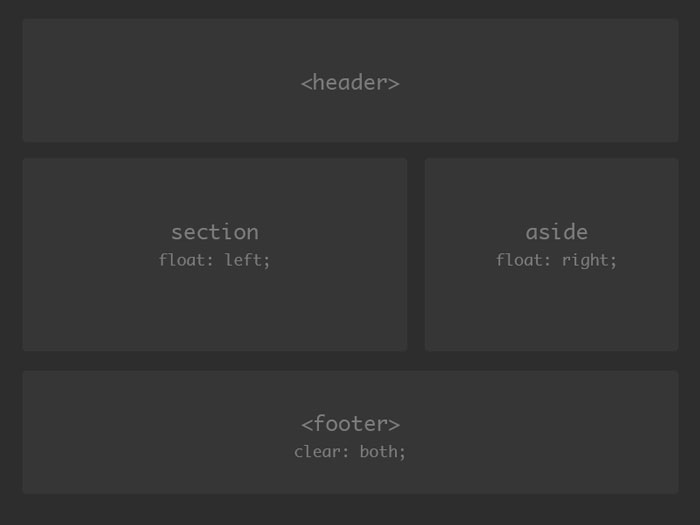 <!-- this is a basic html document --> <!DOCTYPE html> <html lang="en"]]> <head> <meta charset="utf-8"]]> <title>CSS floats for layout</title> <style type="text/css"]]> header {} section {} aside {} footer{} </style> </head> <body> <header>header</header> <section>section</section> <aside>aside</aside> <footer>footer</footer> </body> </html>