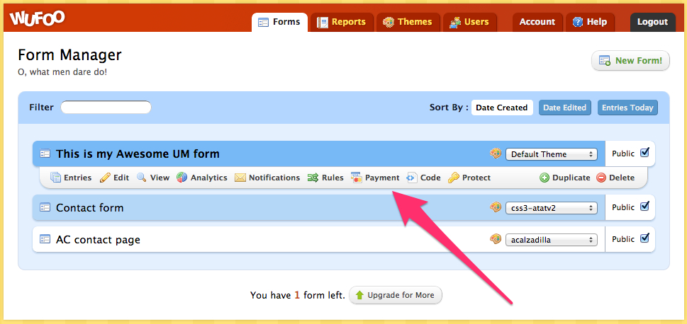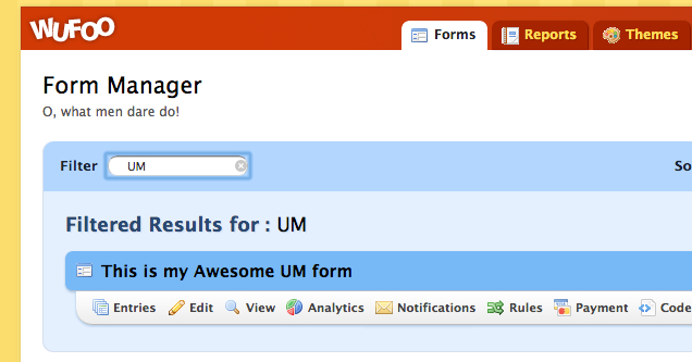 The form manager page is the first page you will see upon logging in to Wufoo. It is a listing of all of the forms you have created, along with different actions you can perform on each form. Additionally, you may view statistics on your forms, and begin creating new forms from this page.