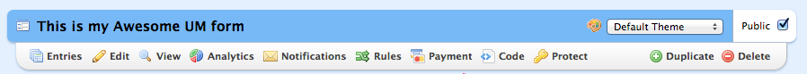 Themes – The drop down box over to the right controls the look of your form. We provide a default theme that is what you see selected, but you can also make a theme with the Theme Designer and then select the theme from the drop down. No pressing of a save button is necessary. Once you select a theme from the drop down, it will be applied to the form.